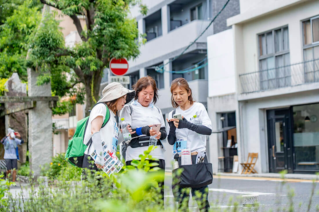 専用GPSアプリを使ってチームで街巡り。チェックポイントに到着するとスマホが位置情報をキャッチしてポイントをゲット!また、設定された謎解きに正解するとさらにボーナスポイントが加算されます。仲間や家族とゲーム感覚で楽しみながら地域の魅力を発見できます。